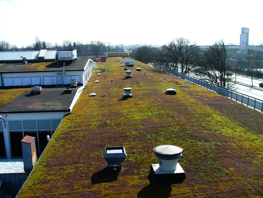 Large warehouse with grass growing on the roof